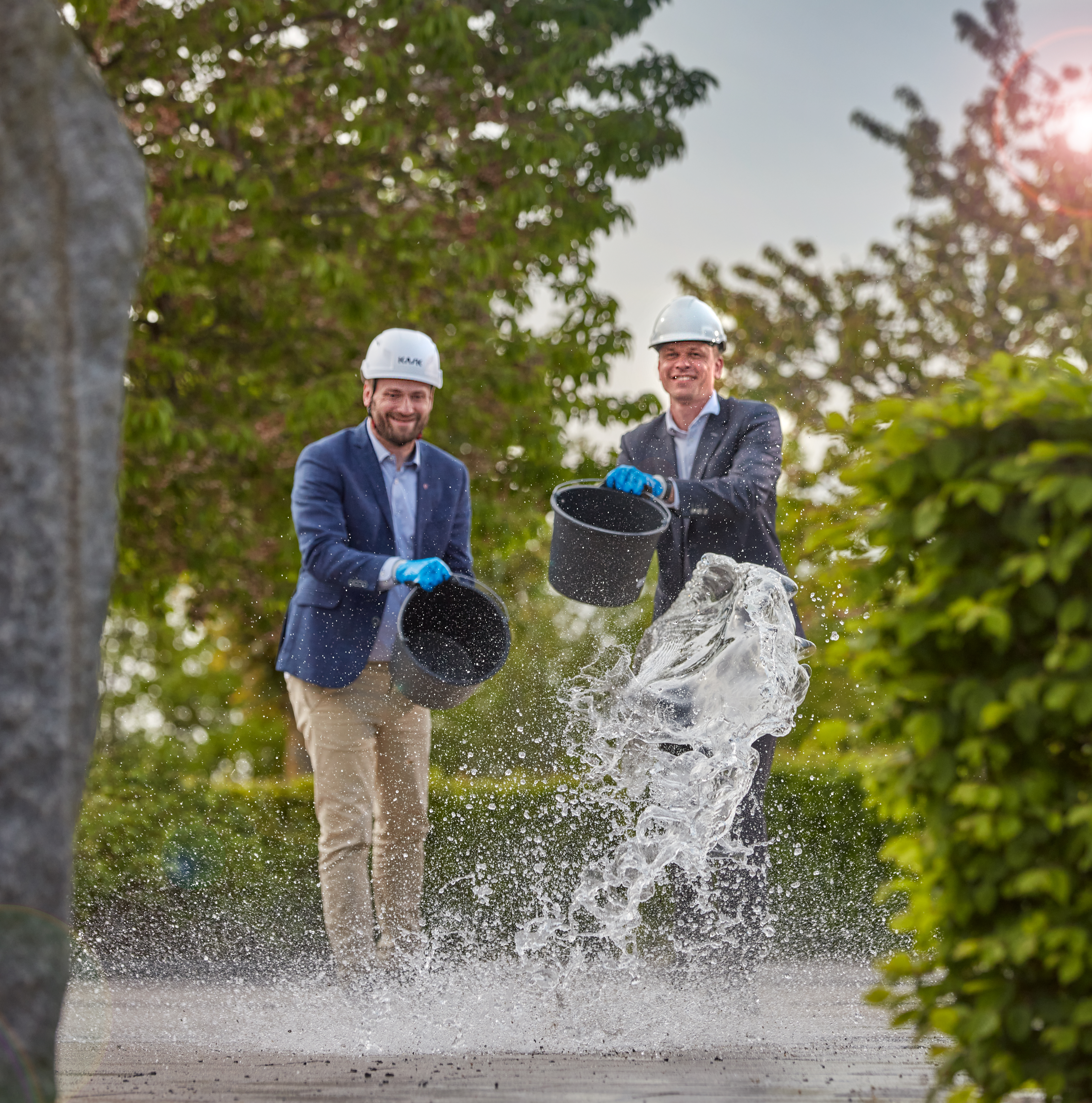 Foto: Borgmester Michael Stegger Jensen og borgmester Kasper Bjerregaard kaster med vand ved markeringen af fusionen.